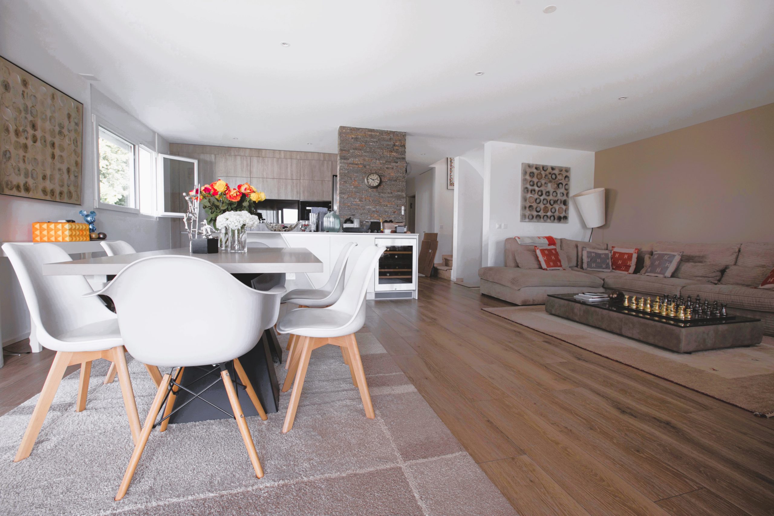 Dans la partie jour, vous découvrirez une spacieuse et lumineuse pièce de vie pourvue d’un espace dinatoire communicant avec une grande cuisine, parfaite pour recevoir vos proches et partager des moments de qualité. Depuis cet espace, vous pourrez accéder directement à l’extérieur, donnant sur une magnifique terrasse de 41 m² ainsi qu’un jardin de 400 m².